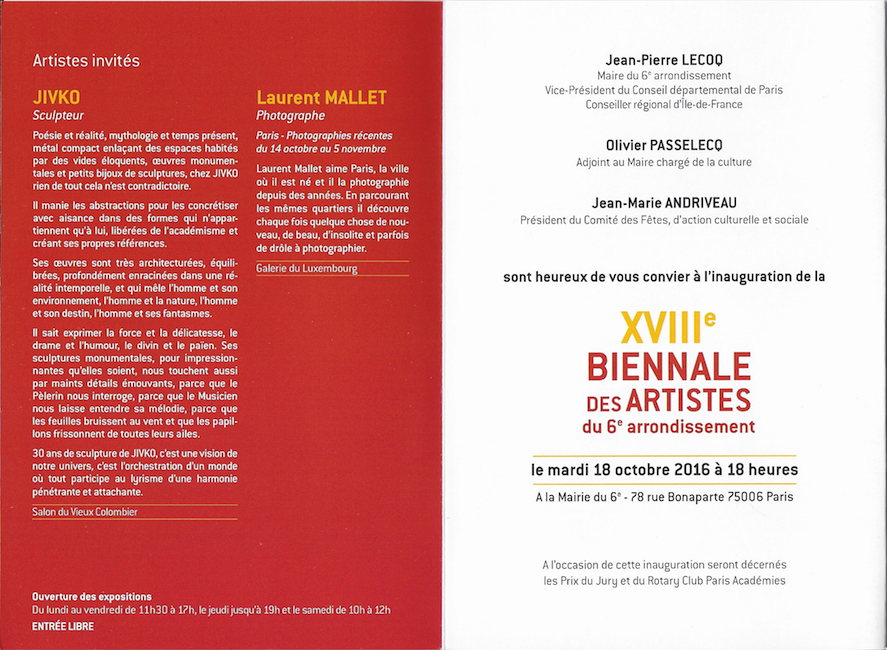 Du 18 octobre au 5 novembre 2016, du lundi au vendredi de 11h30 à 17h, le jeudi jusqu’à 19h et le samedi de 10h à 12h, à la Salle des Fêtes de la Mairie du VIème, 78 rue Bonaparte 75006 Paris
