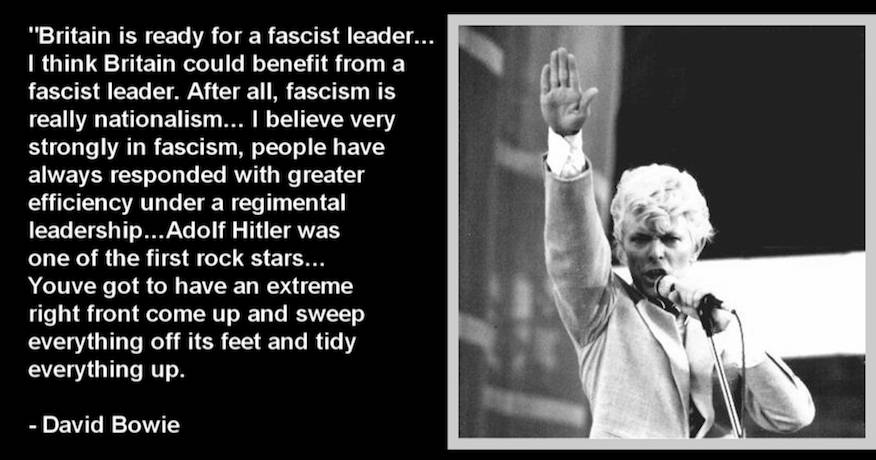Ayant été soumis à des doses massives de drogues, à des confusions radicales de l’identité sexuelle et donc à une grande influence des idéologies fanatisées, David Bowie a, par exemple, développé des discours extrêmes dans une interview à Playboy, en 1976.