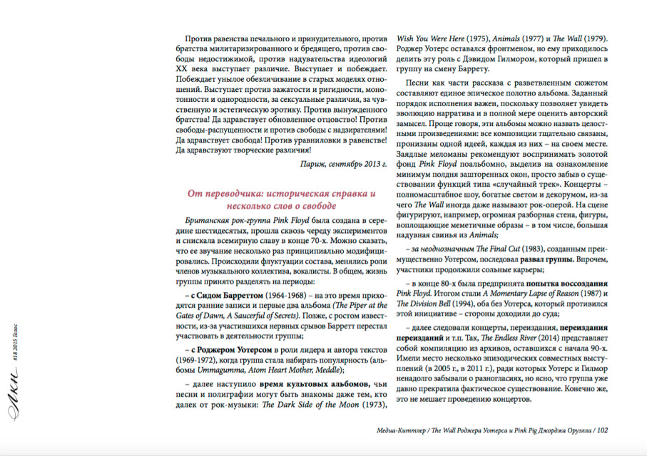 Герман Марс Росс (German Arce Ross), The Wall Роджера Уотерса и Pink Pig Джорджа Оруэлла, Новый психопатология и психоанализ, PsychanalyseVideoBlog.com, Париж, сентябрь 2013 г. Перевод: Полина Ювченко