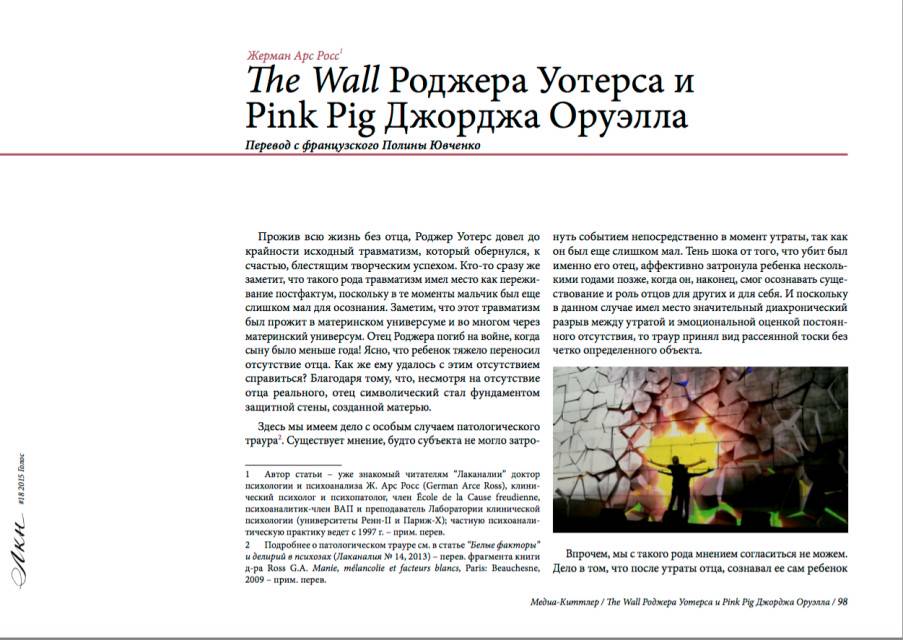 Je remercie de tout coeur notre chère amie Pauline Iuvchenko, psychanalyste à Kiev, pour la traduction en russe de notre texte sur « Le Wall de Roger Waters et le Pink Pig de George Orwell » qui a été publié dans la revue de psychanalyse Lacania, n° 18, Saint Petersburg, 2015, pp. 98-103.